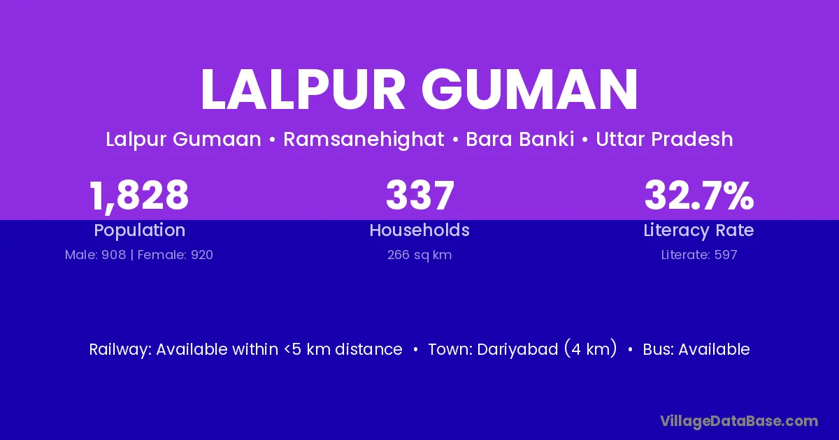 Dariyabad (4 km) is the nearest town to Lalpur Guman village for major economic activities and is located approximately 4 km away.