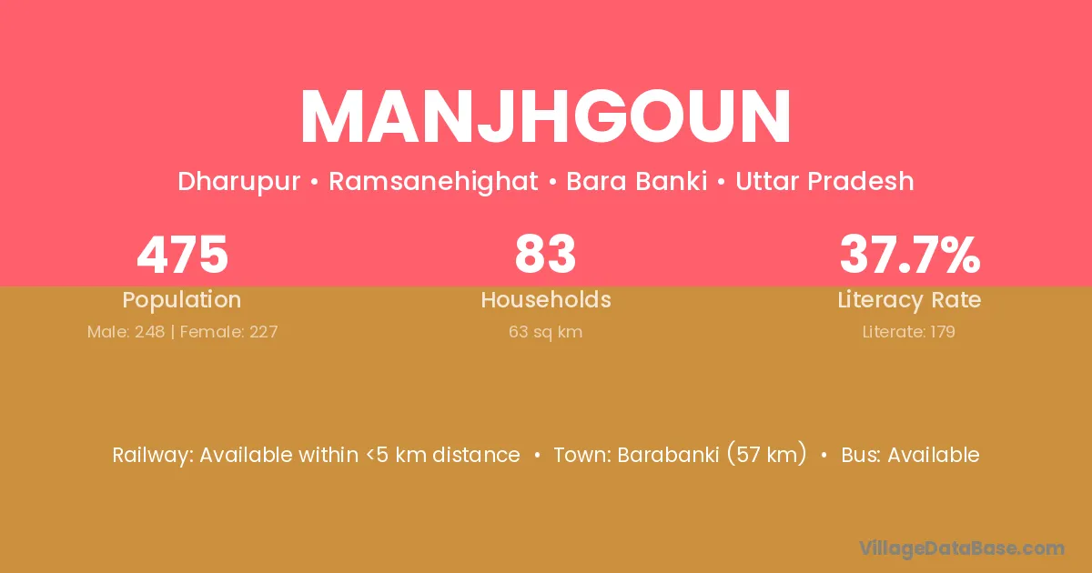 Barabanki (57 km) is the nearest town to Manjhgoun village for major economic activities and is located approximately 57 km away.