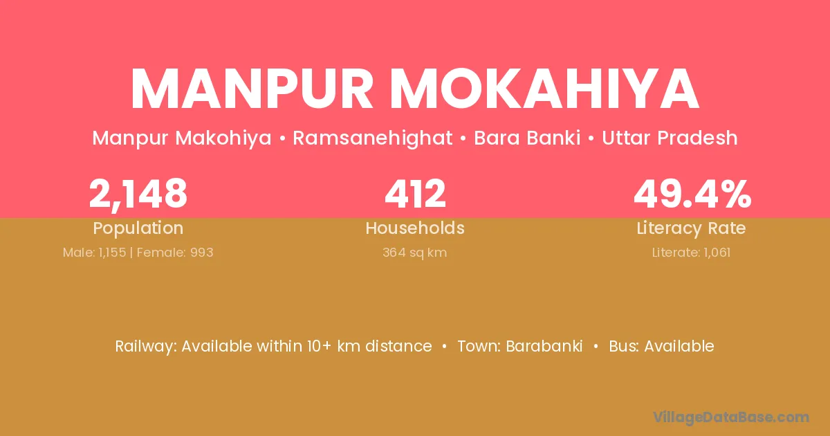 Manpur Mokahiya village has a total population of 2,148 people, of which 1,155 are males and 993 are females.