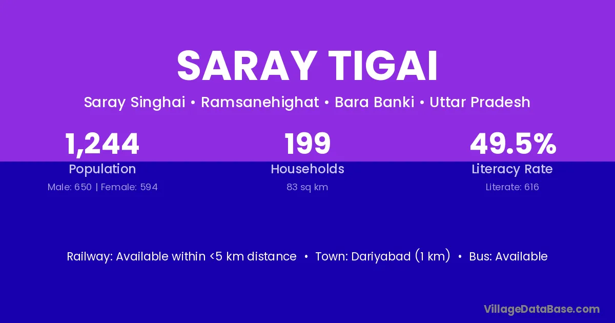 Saray Tigai village has a total population of 1,244 people, of which 650 are males and 594 are females.