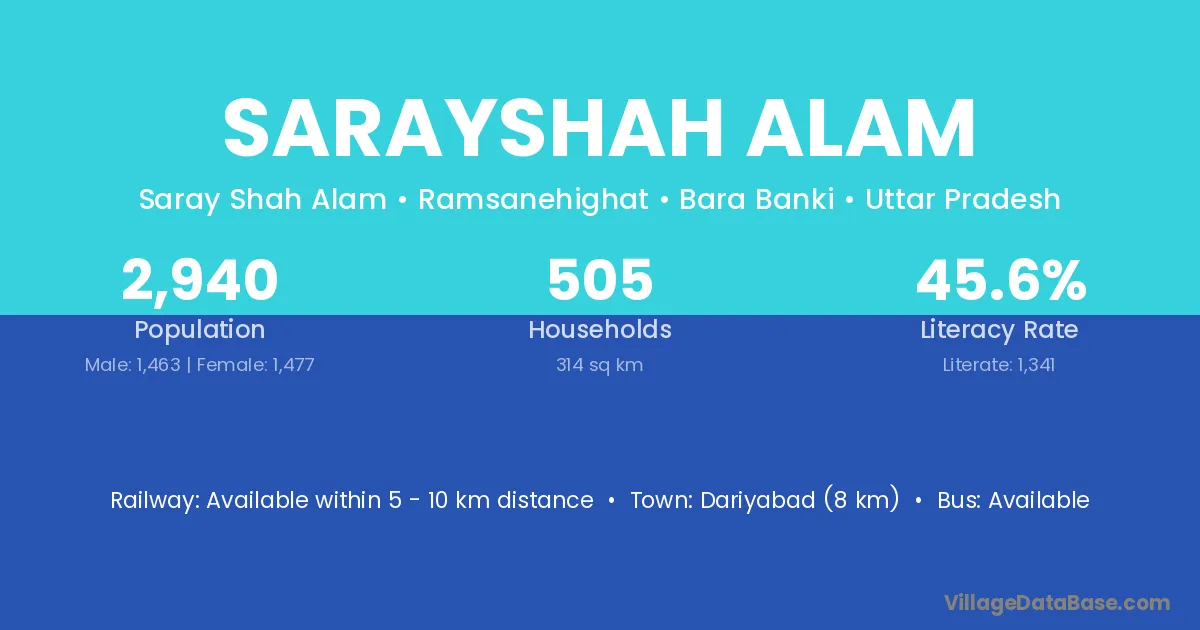 Dariyabad (8 km) is the nearest town to Sarayshah Alam village for major economic activities and is located approximately 8 km away.