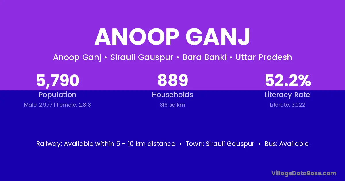 Anoop Ganj village has a total population of 5,790 people, of which 2,977 are males and 2,813 are females.