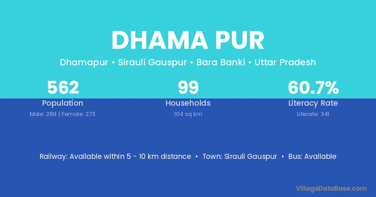 Dhama Pur village has a total population of 562 people, of which 289 are males and 273 are females.