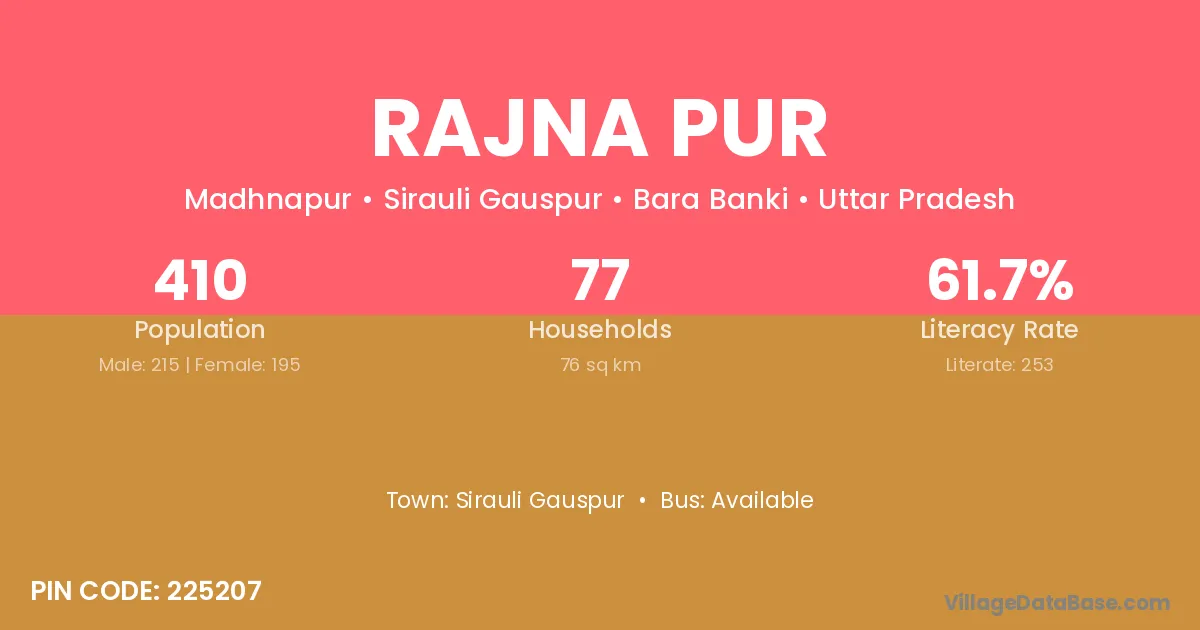 Rajna Pur village has a total population of 410 people, of which 215 are males and 195 are females.