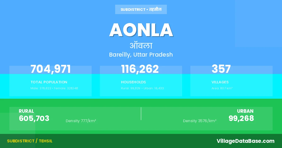 According to the 2011 census The total area of Aonla Tehsil is 807 km², with a population of 704971 people. The population density is 873 inhabitants per square kilometre, and there are approximately 116262 houses in the sub district.