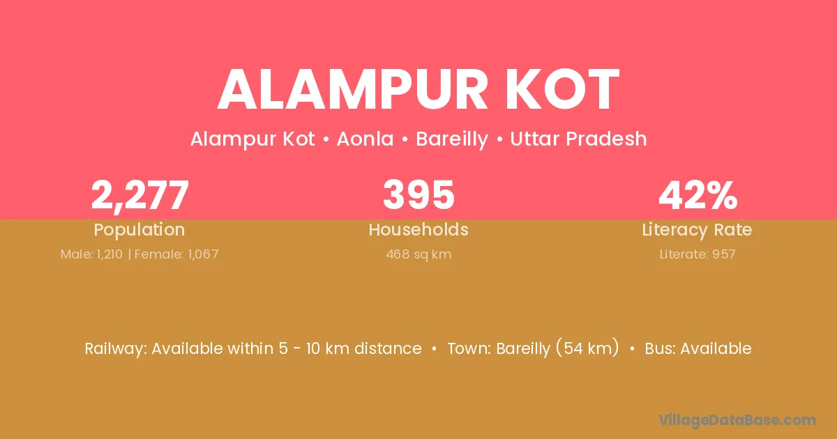 Bareilly (54 km) is the nearest town to Alampur Kot village for major economic activities and is located approximately 54 km away.