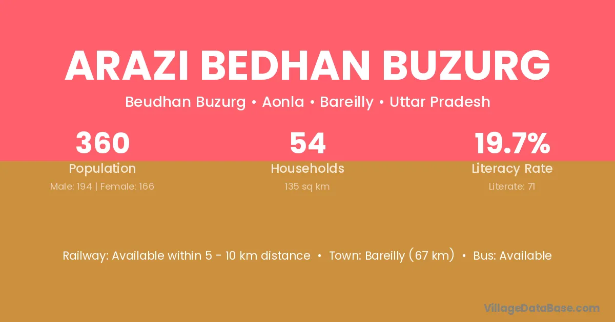Bareilly (67 km) is the nearest town to Arazi Bedhan Buzurg village for major economic activities and is located approximately 67 km away.