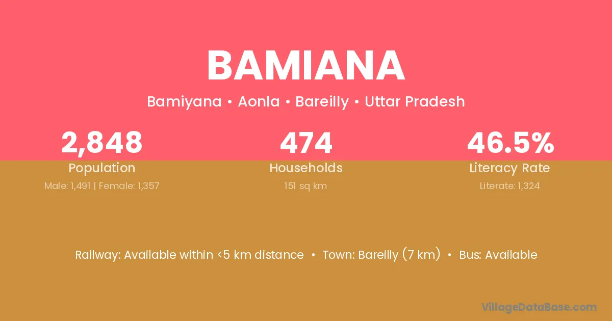 Bareilly (7 km) is the nearest town to Bamiana village for major economic activities and is located approximately 7 km away.