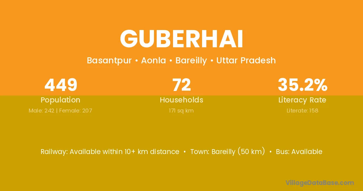 Bareilly (50 km) is the nearest town to Guberhai village for major economic activities and is located approximately 50 km away.