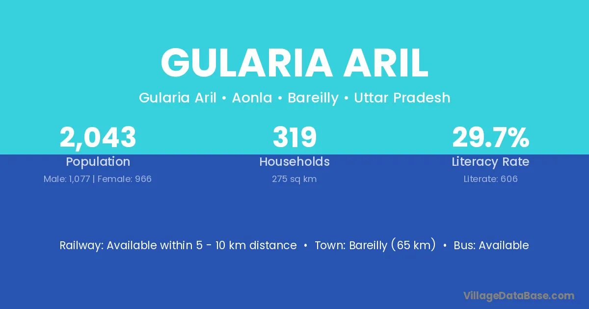 Bareilly (65 km) is the nearest town to Gularia Aril village for major economic activities and is located approximately 65 km away.