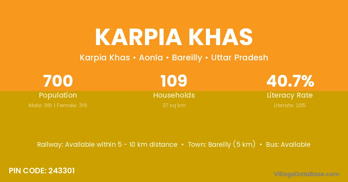 Bareilly (5 km) is the nearest town to Karpia Khas village for major economic activities and is located approximately 5 km away.