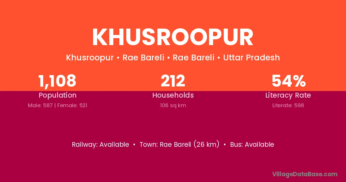Bareilly (20 km) is the nearest town to Khusroopur village for major economic activities and is located approximately 20 km away.