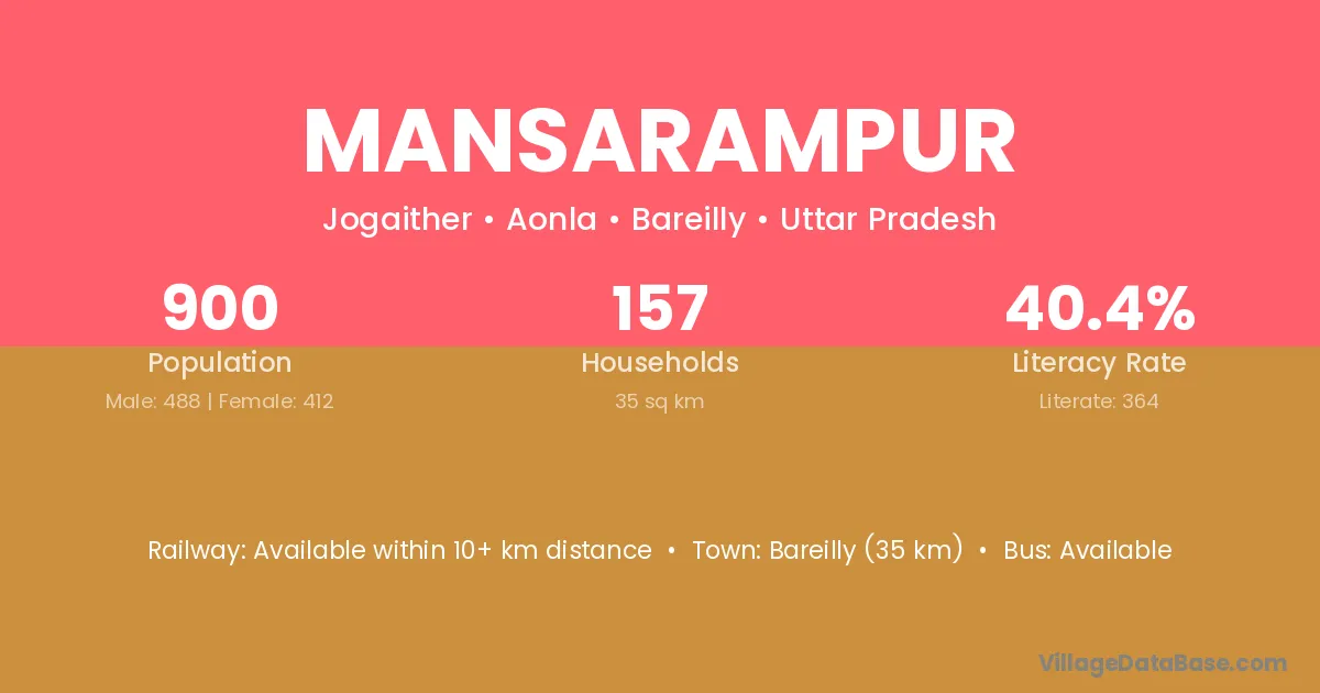 Bareilly (35 km) is the nearest town to Mansarampur village for major economic activities and is located approximately 35 km away.