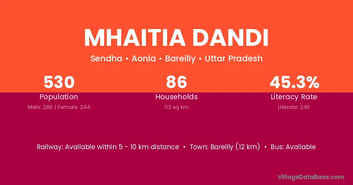 Bareilly (12 km) is the nearest town to Mhaitia Dandi village for major economic activities and is located approximately 12 km away.
