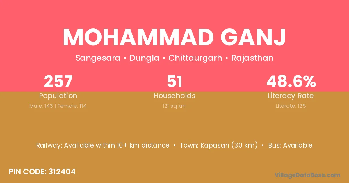 Mohammad Ganj village has a total population of 600 people, of which 313 are males and 287 are females.
