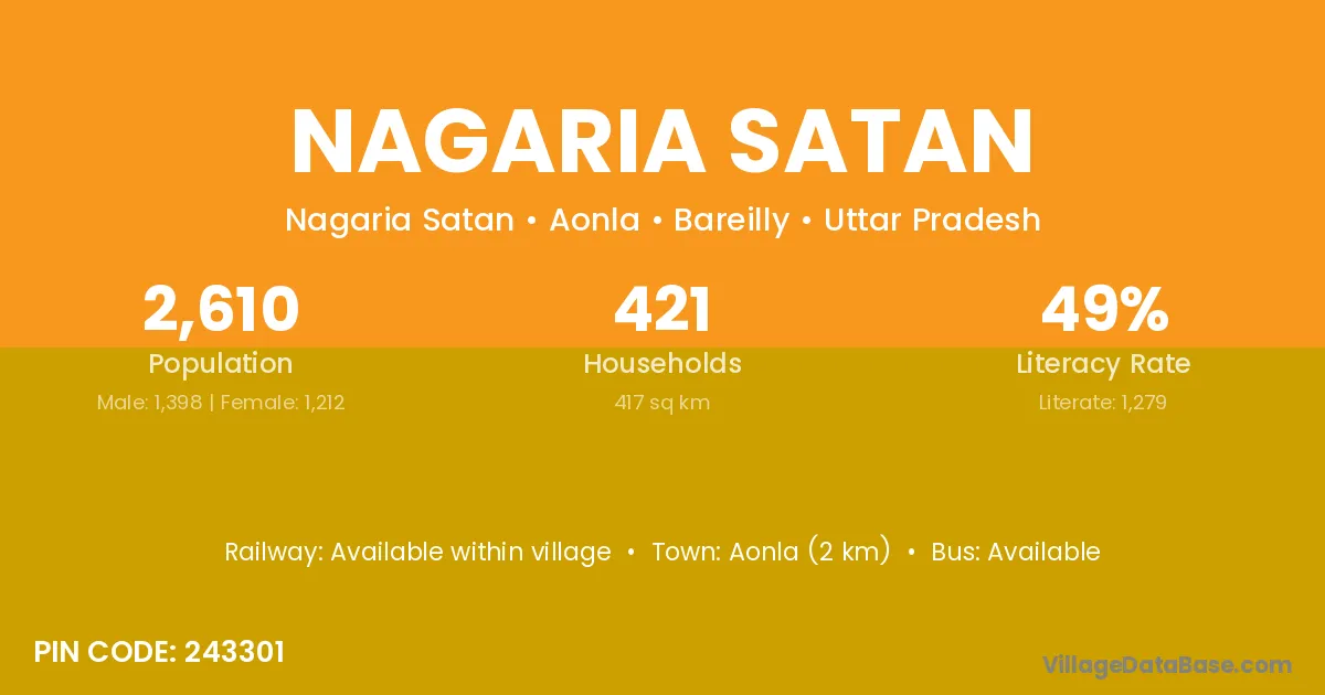 Aonla (2 km) is the nearest town to Nagaria Satan village for major economic activities and is located approximately 2 km away.