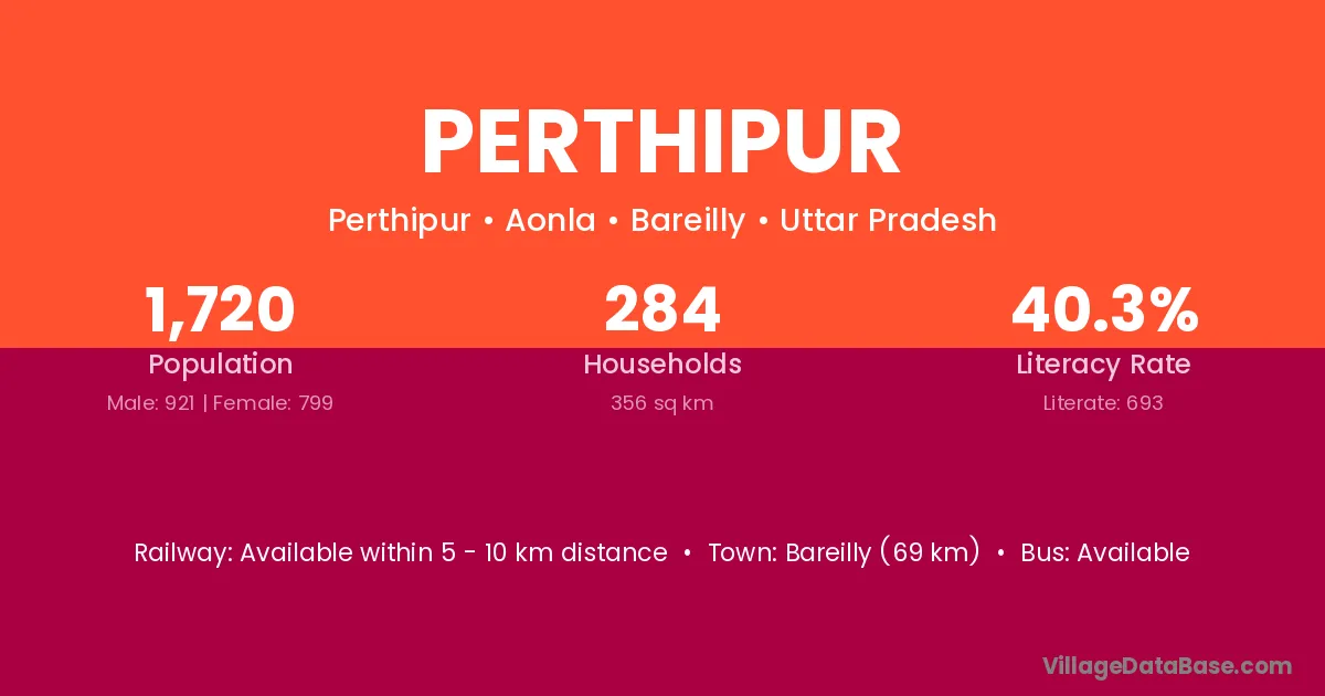 Bareilly (69 km) is the nearest town to Perthipur village for major economic activities and is located approximately 69 km away.