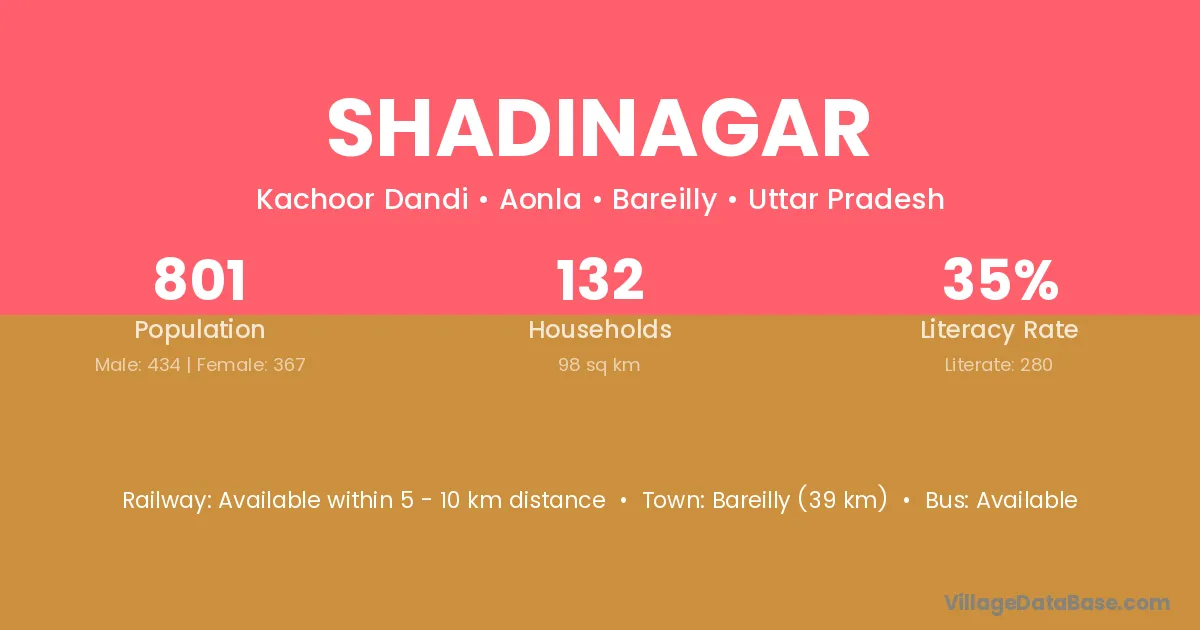 Bareilly (39 km) is the nearest town to Shadinagar village for major economic activities and is located approximately 39 km away.