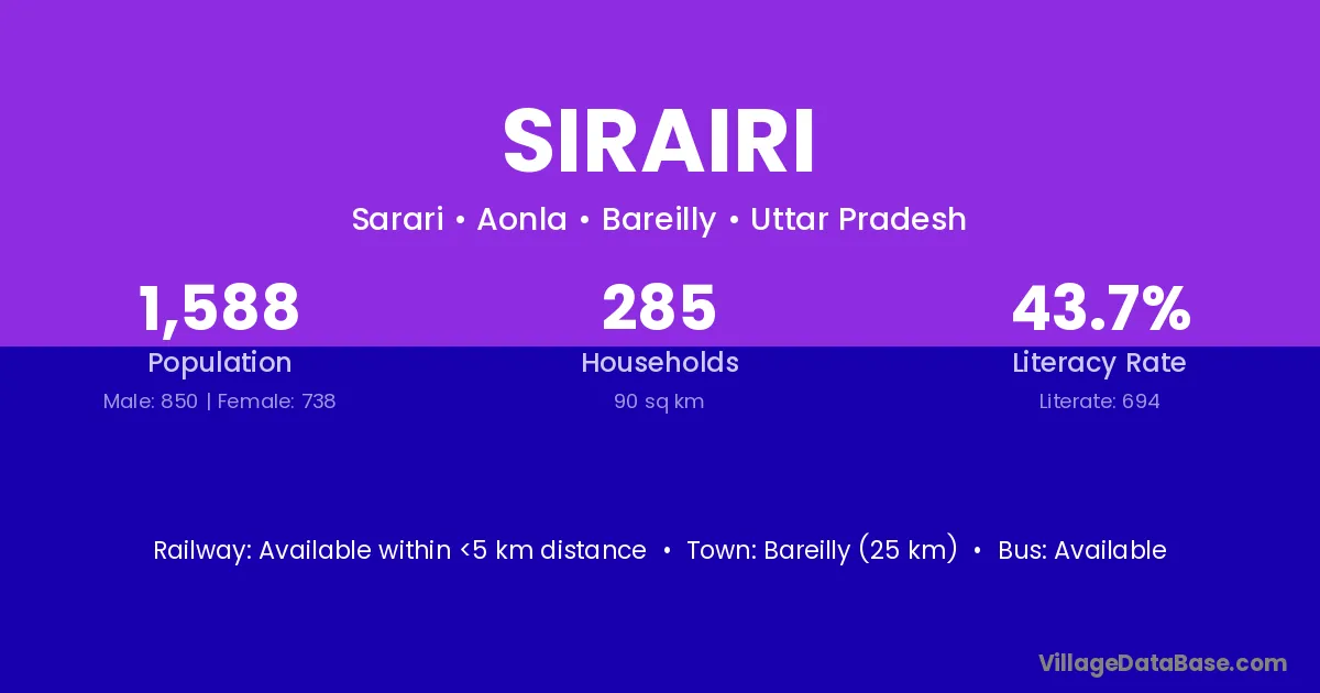 Bareilly (25 km) is the nearest town to Sirairi village for major economic activities and is located approximately 25 km away.