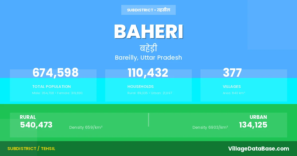 According to the 2011 census The total area of Baheri Tehsil is 840 km², with a population of 674598 people. The population density is 803 inhabitants per square kilometre, and there are approximately 110432 houses in the sub district.