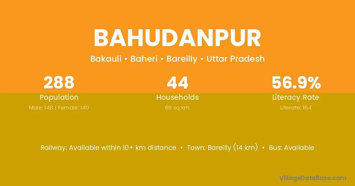Bareilly (14 km) is the nearest town to Bahudanpur village for major economic activities and is located approximately 14 km away.