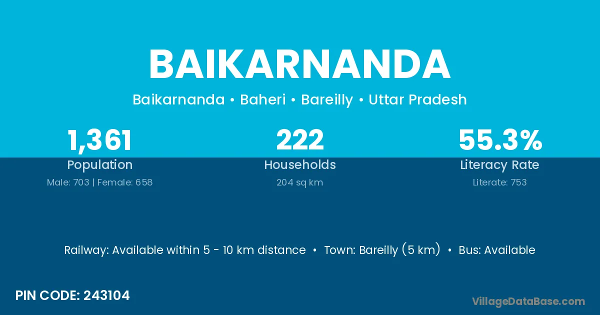 Bareilly (5 km) is the nearest town to Baikarnanda village for major economic activities and is located approximately 5 km away.