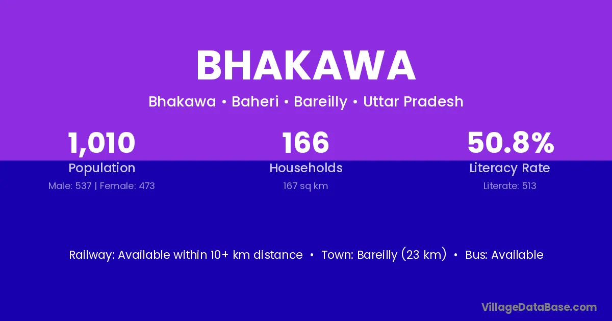 Bareilly (23 km) is the nearest town to Bhakawa village for major economic activities and is located approximately 23 km away.