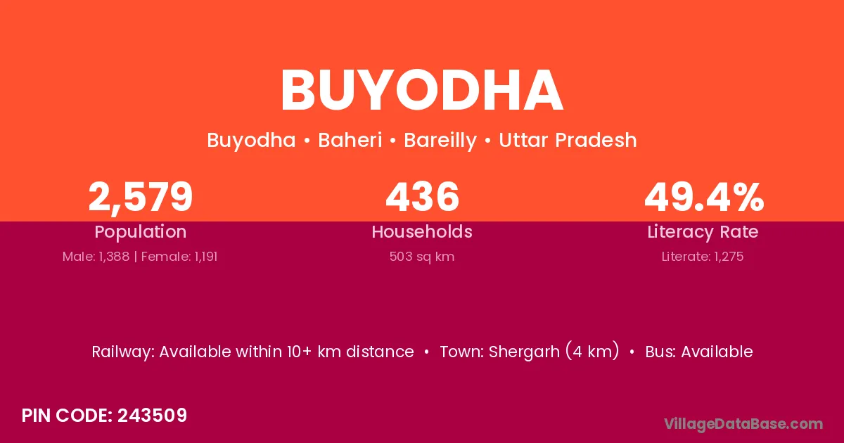 According to Census 2011 information, the village code of Buyodha village is 243509.