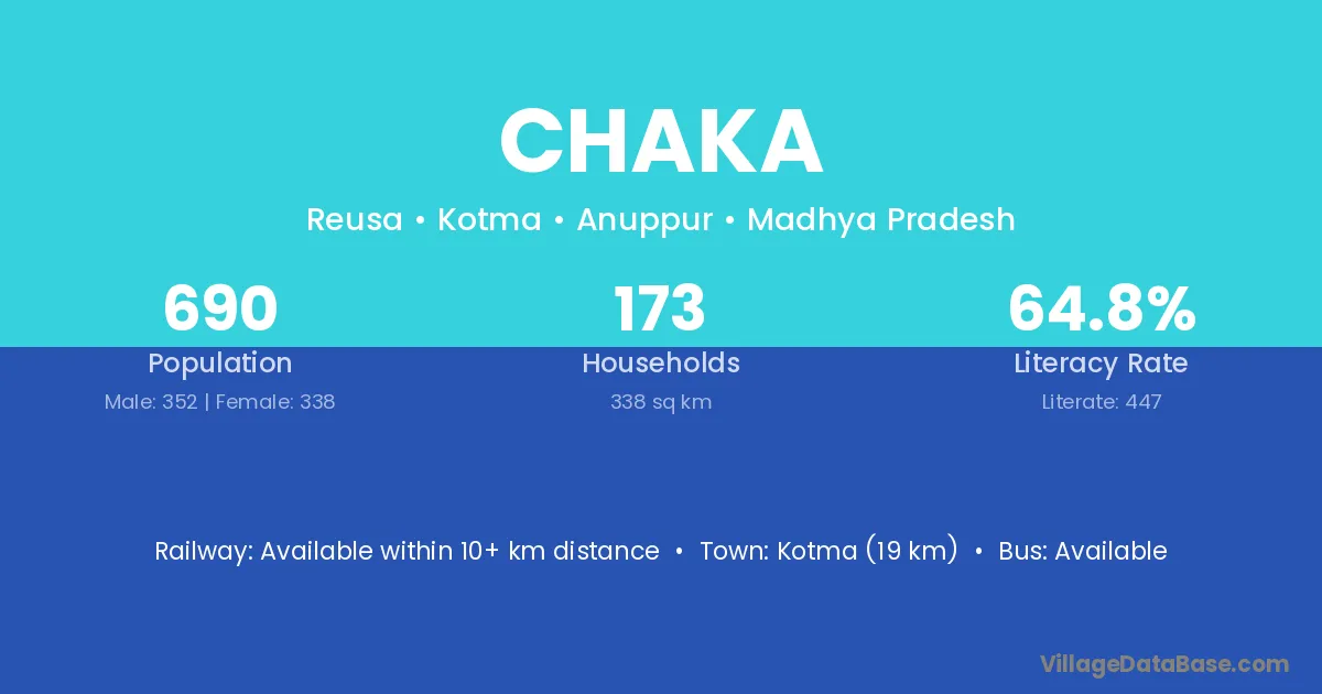 The literacy rate of Chaka village is 21.69%. Male literacy stands at 22.12% and female literacy at 21.23%.