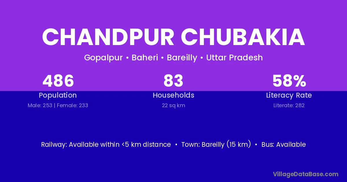 Bareilly (15 km) is the nearest town to Chandpur Chubakia village for major economic activities and is located approximately 15 km away.