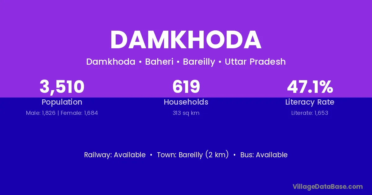 Bareilly (2 km) is the nearest town to Damkhoda village for major economic activities and is located approximately 2 km away.