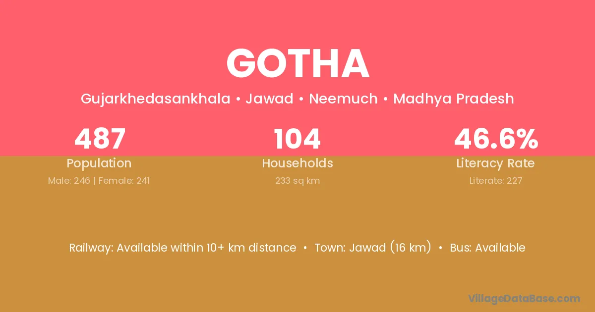 The literacy rate of Gotha village is 53.89%. Male literacy stands at 58.26% and female literacy at 48.82%.