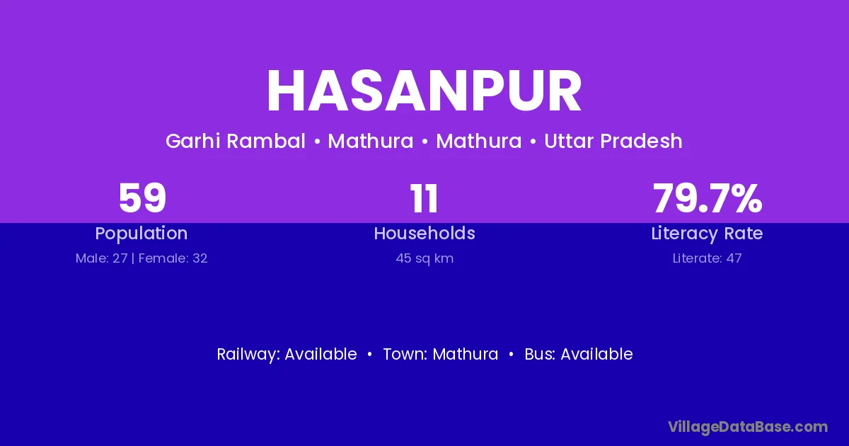 The literacy rate of Hasanpur village is 39.17%. Male literacy stands at 47.75% and female literacy at 29.92%.