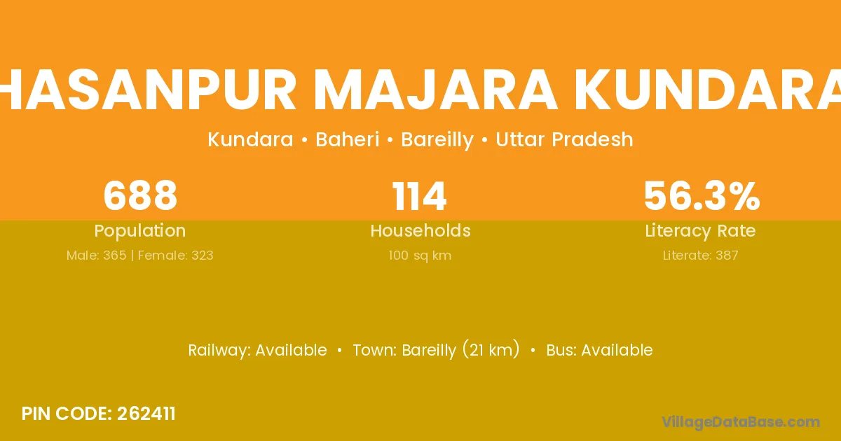 Bareilly (21 km) is the nearest town to Hasanpur Majara Kundara village for major economic activities and is located approximately 21 km away.