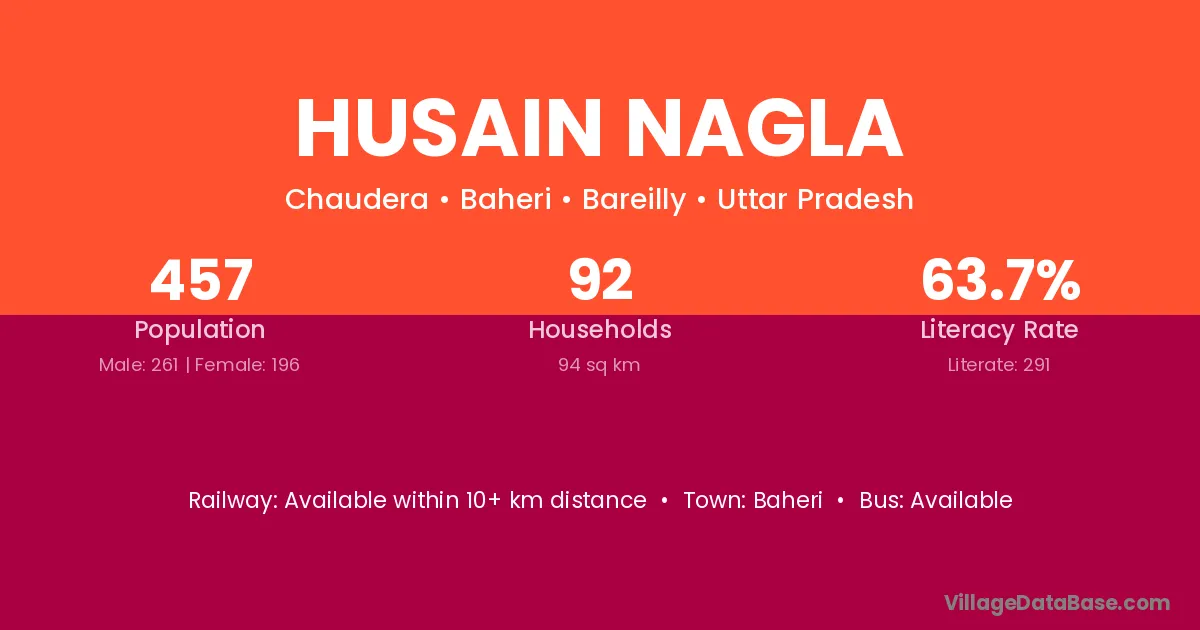 Husain Nagla village has a total population of 457 people, of which 261 are males and 196 are females.