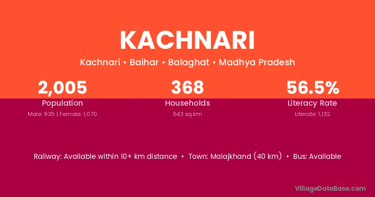 The literacy rate of Kachnari village is 53.94%. Male literacy stands at 65.60% and female literacy at 40.45%.