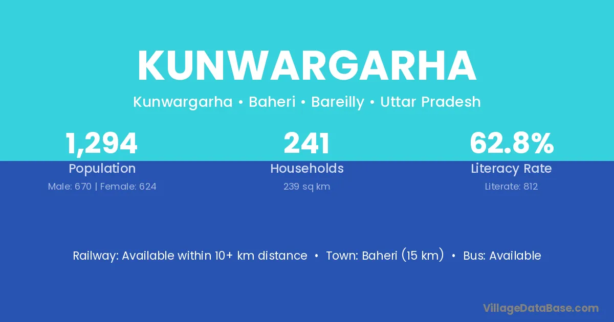 Baheri (15 km) is the nearest town to Kunwargarha village for major economic activities and is located approximately 15 km away.