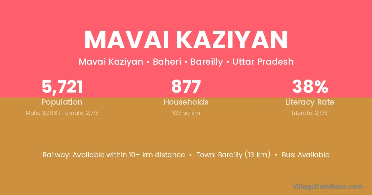 Bareilly (13 km) is the nearest town to Mavai Kaziyan village for major economic activities and is located approximately 13 km away.