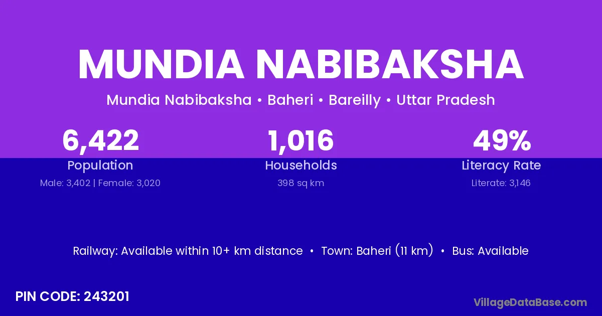 Baheri (11 km) is the nearest town to Mundia Nabibaksha village for major economic activities and is located approximately 11 km away.