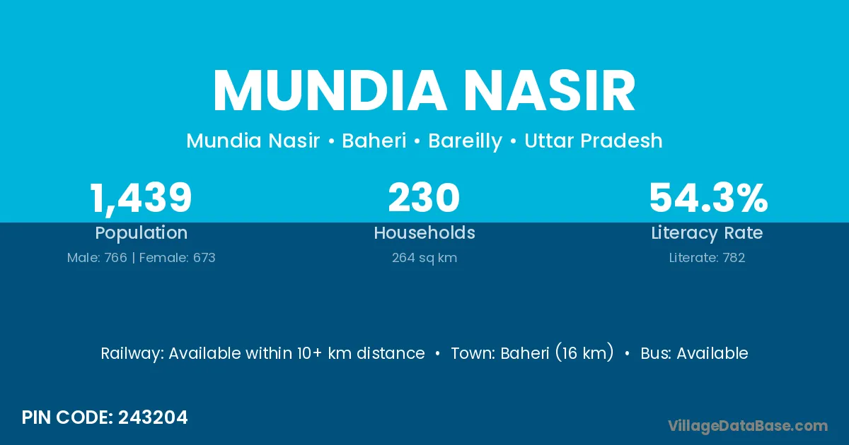 Baheri (16 km) is the nearest town to Mundia Nasir village for major economic activities and is located approximately 16 km away.