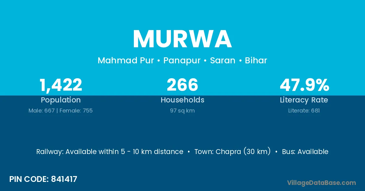 The literacy rate of Murwa village is 42.17%. Male literacy stands at 50.21% and female literacy at 33.68%.