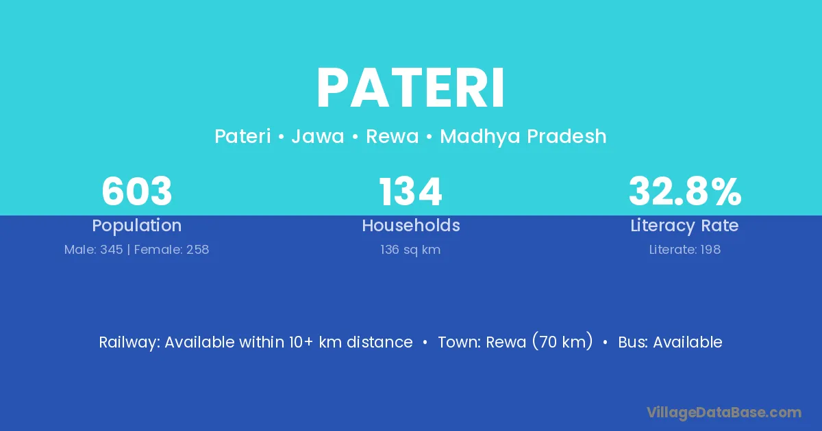 The literacy rate of Pateri village is 33.33%. Male literacy stands at 34.15% and female literacy at 32.26%.