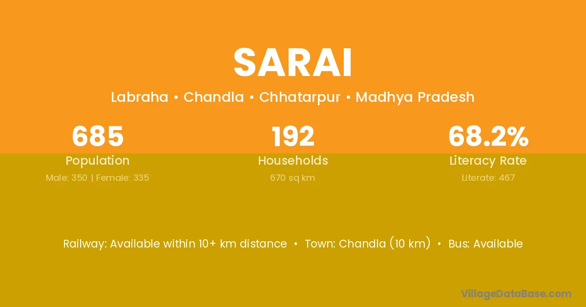 The literacy rate of Sarai village is 50.14%. Male literacy stands at 60.86% and female literacy at 38.29%.