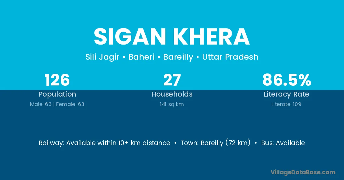 Bareilly (72 km) is the nearest town to Sigan Khera village for major economic activities and is located approximately 72 km away.