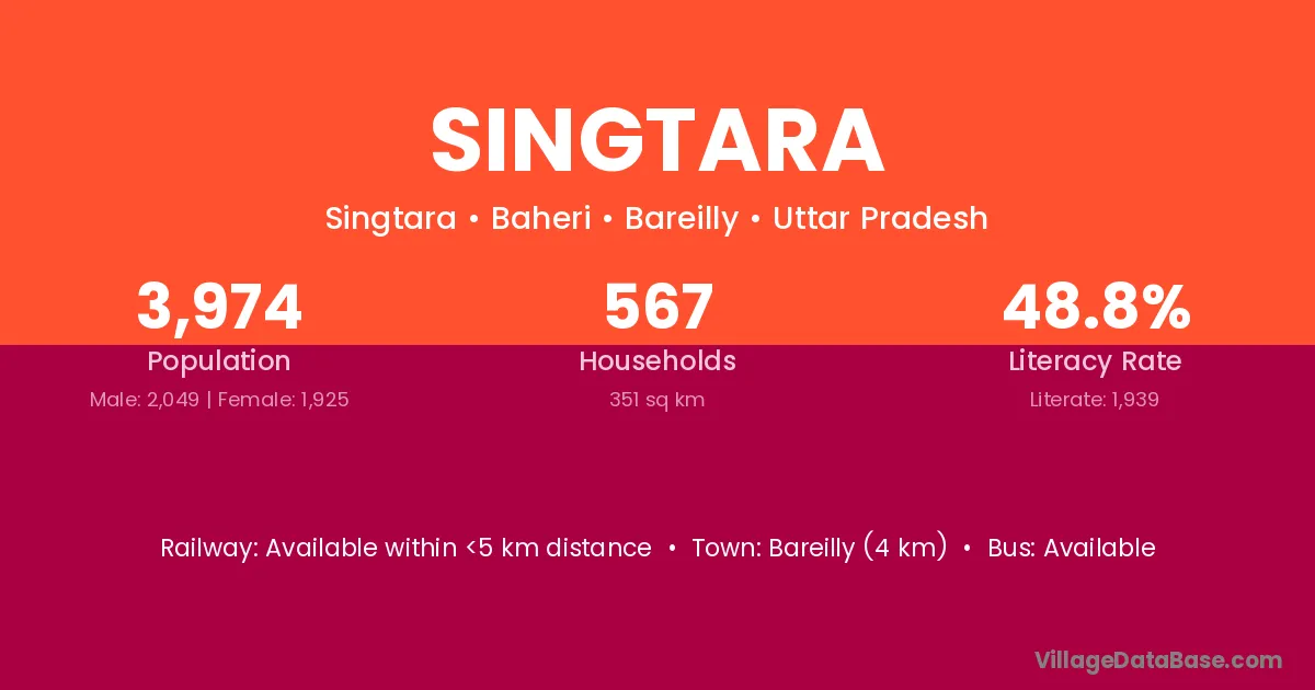 Bareilly (4 km) is the nearest town to Singtara village for major economic activities and is located approximately 4 km away.