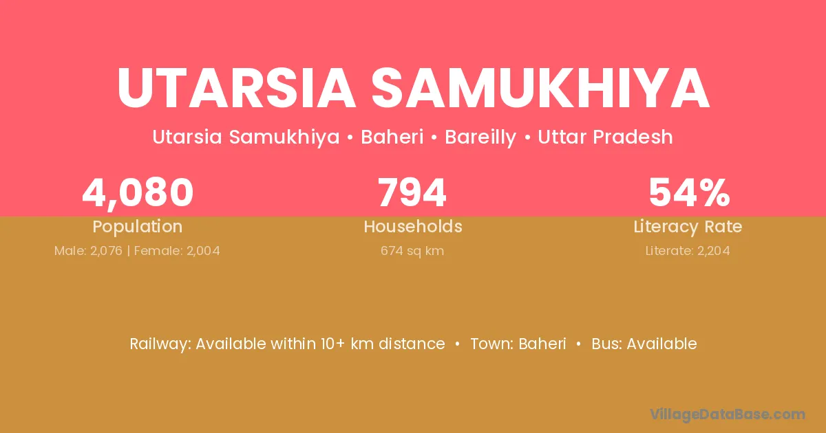 Utarsia Samukhiya village has a total population of 4,080 people, of which 2,076 are males and 2,004 are females.