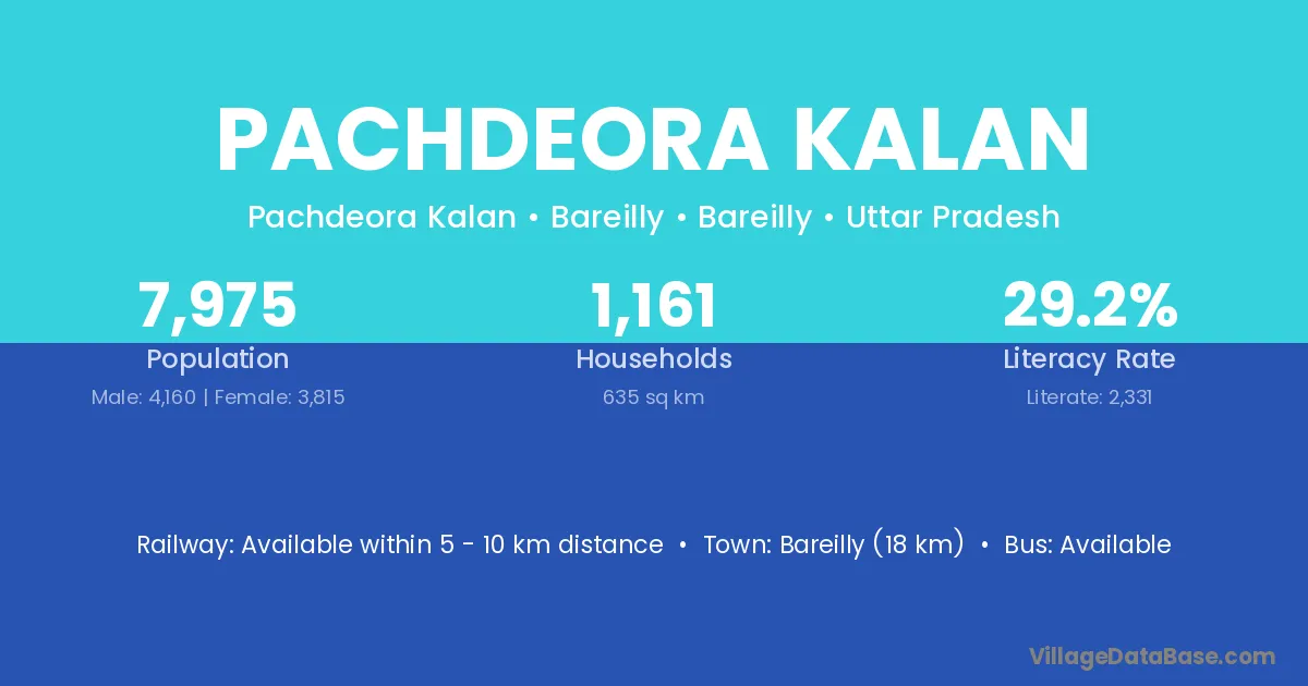 Bareilly (18 km) is the nearest town to Pachdeora Kalan village for major economic activities and is located approximately 18 km away.