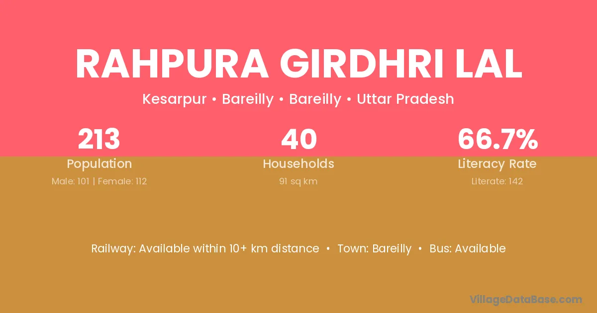 Rahpura Girdhri Lal village has a total population of 213 people, of which 101 are males and 112 are females.
