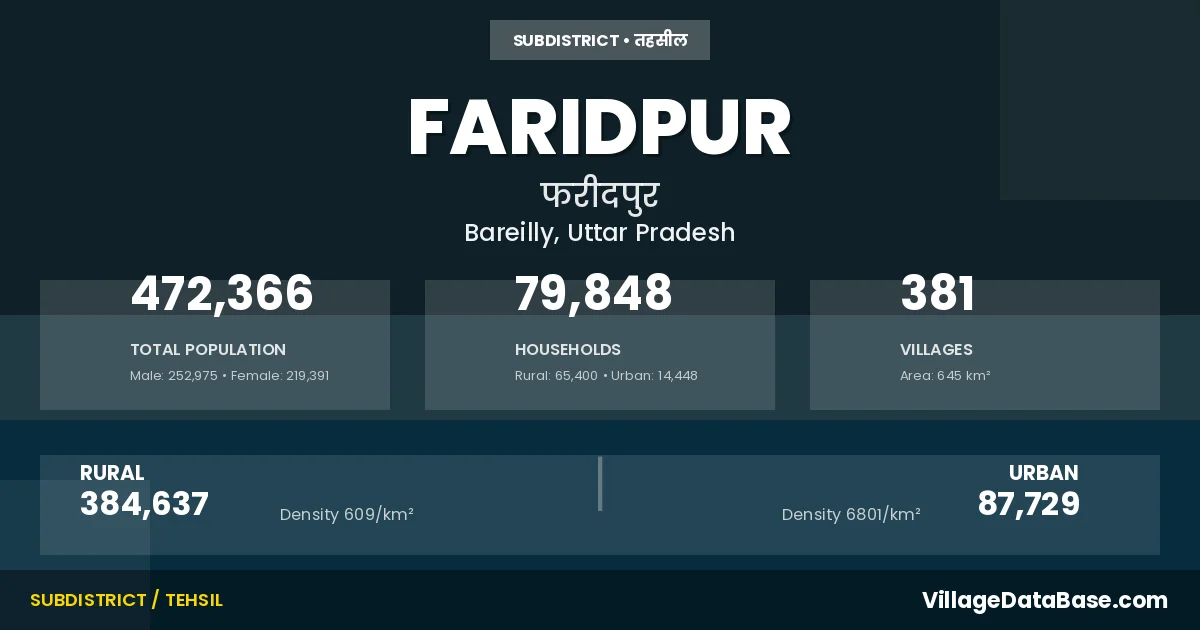 According to the 2011 census The total area of Faridpur Tehsil is 645 km², with a population of 472366 people. The population density is 733 inhabitants per square kilometre, and there are approximately 79848 houses in the sub district.