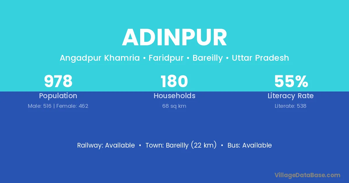 Bareilly (22 km) is the nearest town to Adinpur village for major economic activities and is located approximately 22 km away.